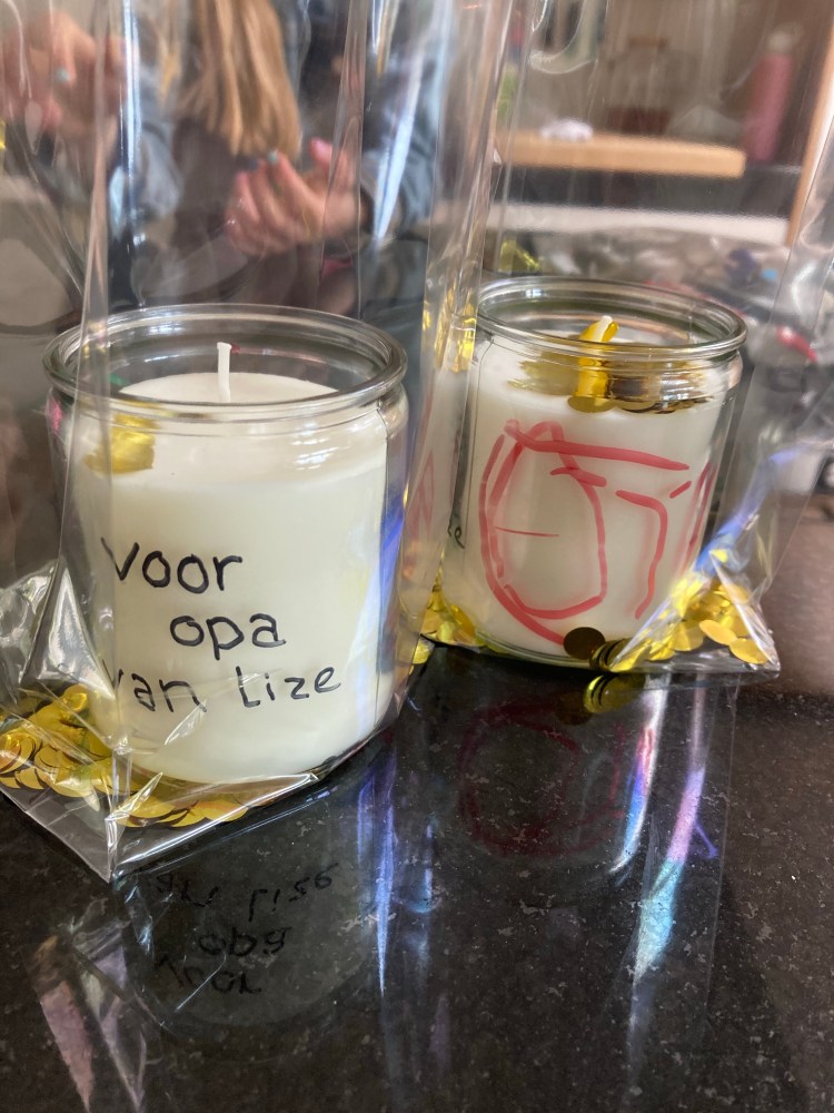 We besloten om het afscheid samen met de kids te doen na de begrafenis. Wel zorgde we ervoor dat ze iets konden maken wat we mee konden nemen zodat ze er toch een beetje bij konden zijn. Ze hebben samen met ons 2 kaarsjes gekleurd voor opa. Eentje voor op de kist die wij mee zouden nemen en eentje voor het afscheid dat we zelf later zouden hebben. De middag dat we de kaarsjes samen aan het kleuren waren, was mooi. Ze deden alle drie mega hun best om er iets moois van te maken. Daan kleurde bijvoorbeeld 1 kant van het kaarsje rood, dit was opa die dood was, de andere kant was geel, dit was de Hemel waar opa was, hij was daar blij want zijn lijf deed geen pijn meer.