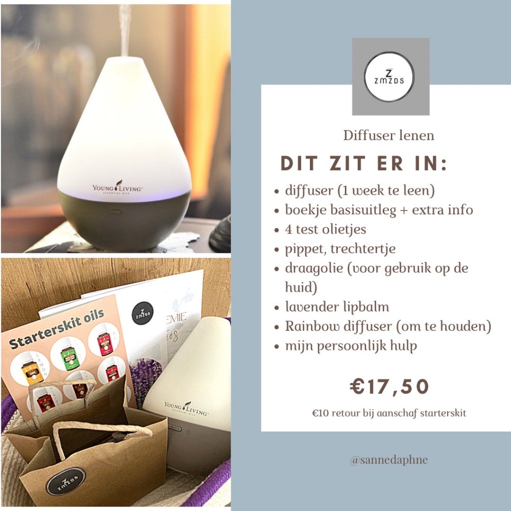 Zo leuk! Ik heb speciaal voor jou een diffuser probeer pakket samengesteld. Je kunt de diffuser testen, een aantal van mijn favoriete oils proberen en als extraatje kan je ook een eigen roller maken (bijvoorbeeld voor slaap of ontspanning).